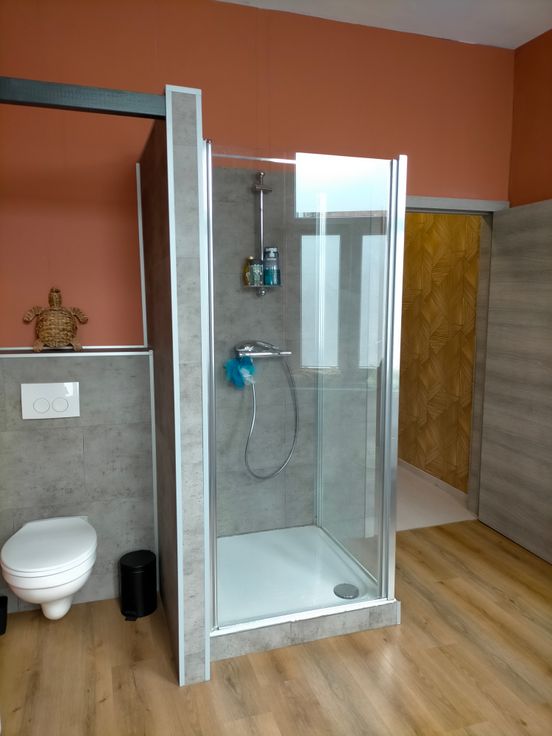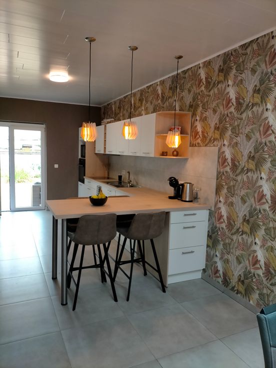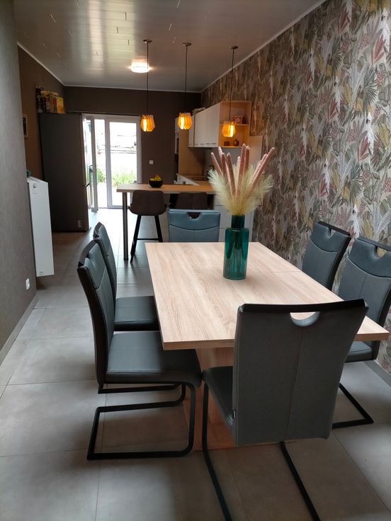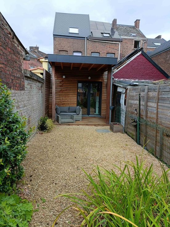Spacieuse maison composée d'une belle entrée avec Wc séparé et dressing, d'une grande pièce de vie de 47 m2 comportant un salon, une salle à manger et une grande cuisine avec coin à manger, une terrasse couverte et un jardin de ville. Au premier étage, on trouve une chambre et une salle d'eau spacieuse avec un Wc semi séparé.