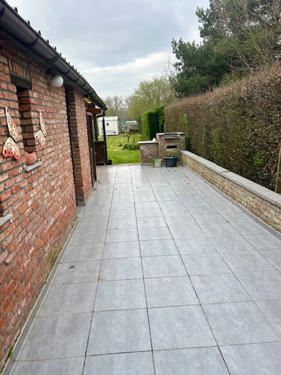 De gezinswoning omvat: inkom, living, geïnstalleerde keuken, badkamer, garage, berging en zeer gezellige tuin met aangelegd terras, buitenberging en nog een extra tuinhuis.