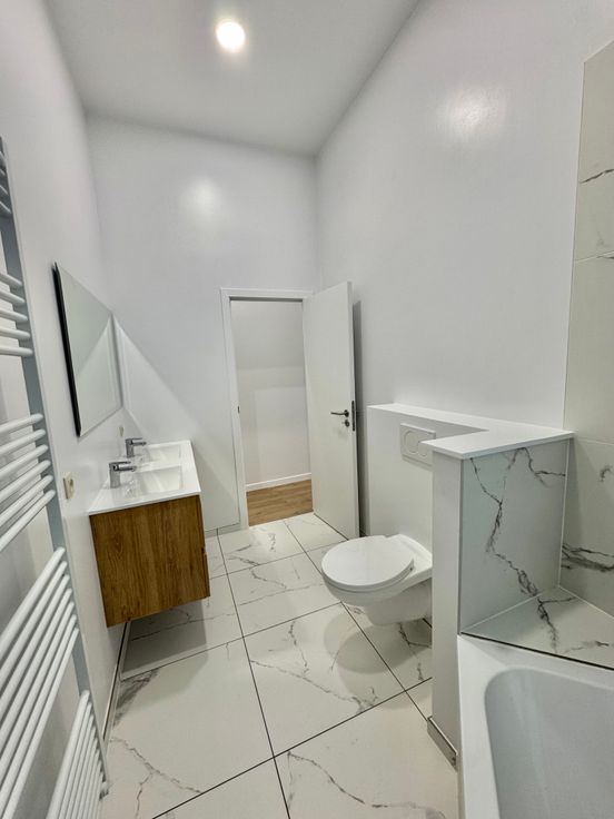 L'appartement se compose d'un très grand séjour avec cuisine ouverte full équipée, de deux chambre séparées, d'une buanderie avec possibilité de placer un lave-linge & séche-linge, d’une salle de bain et d'une salle de douche chacune muni de son WC. Châssis double vitrage. Porte blindée.
