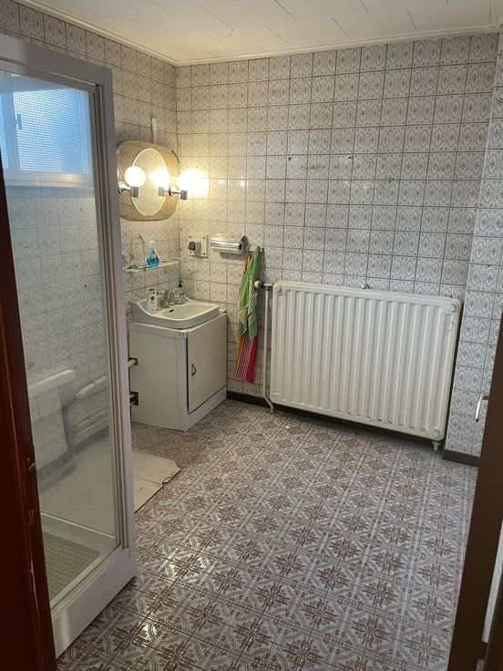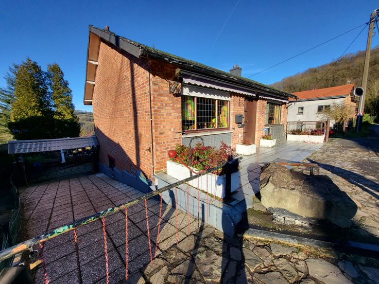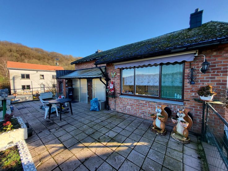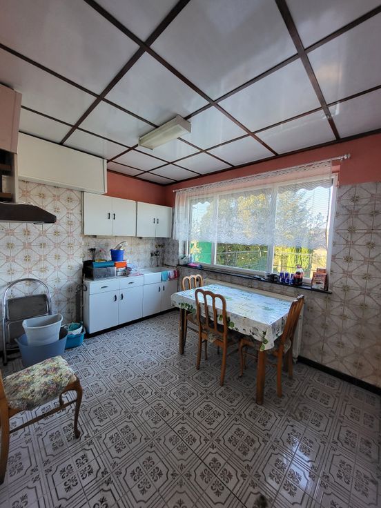 Maison de plain pied avec jardin et garage à rénover - La maison a une superficie de 90m² habitables, 100 m² de caves et garage sur un terrain de 7 ares 6ca - Elle se compose comme suit: hall d'entrée, salon/ salle-à-manger, cuisine, 1 chambre et salle-de-bain avec toilette et une terrasse de 25m² avec vue imprenable sur la campagne!