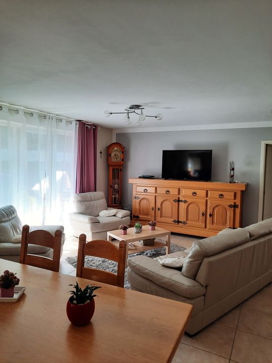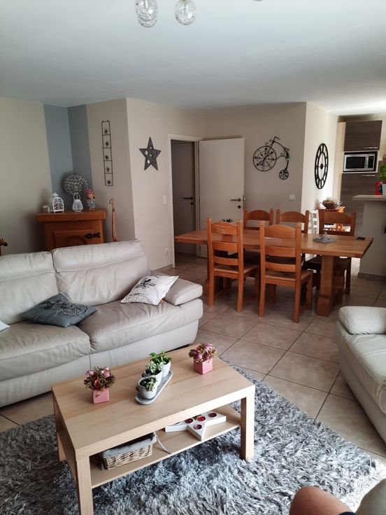 Appartement lumineux et spacieux situé dans un endroit calme, 2 chambres, cuisine ouverte sur le séjour qui donne sur une terrasse. Salle de bain avec douche, WC séparé, hall de nuit
