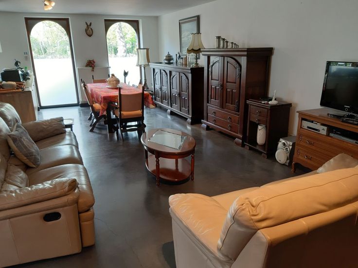 Disposition : Grand espace de vie lumineux avec îlot cuisine