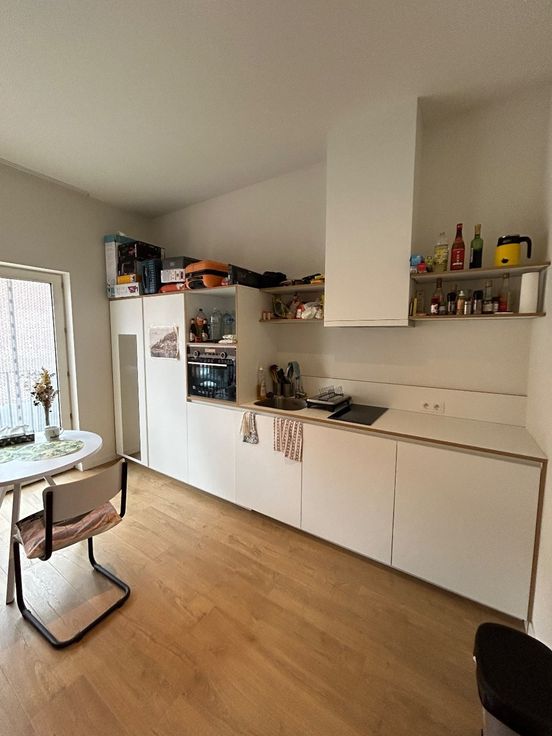 De studio is voorzien van alle nodige voorzieningen, waaronder een keuken met kookplaat, koelkast en voldoende opbergruimte. Daarnaast is er een badkamer met douche, toilet en wastafel. De grote ramen zorgen voor veel natuurlijk lichtinval, wat de ruimte een aangename sfeer geeft.