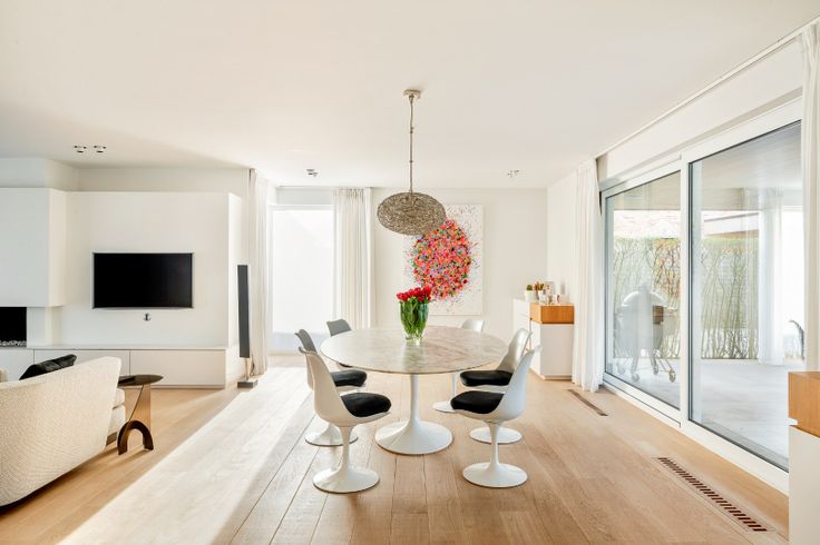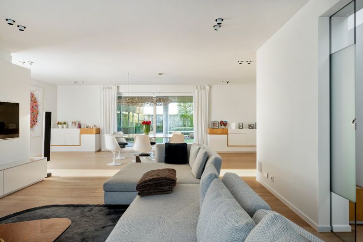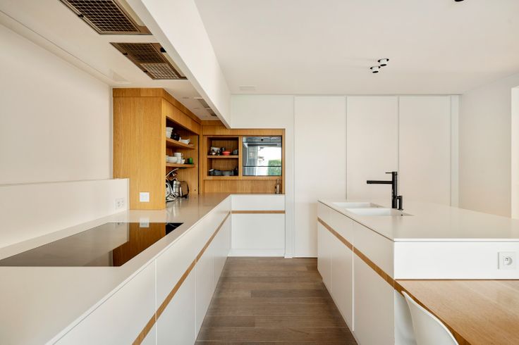 Impressionante inkomhal met apart toilet en toegang naar de leefruimte. Deze leefruimte met designverlichting, gaskachel, parket, muziekinstalatie, inmaakmeubilair, parket,.. is een lichtrijk geheel door de vele raampartijen. Aangenaam is het contact met het grote terras en zwembad. Verder is de leefkeuken. Ook hier Corian, vele inmaakkasten, AQUALEX kraan, opmaaktgemaakte eettafel, dubbel dampkap,.. maar vooral gerieflijk en een overzichtelijke indeling. Aanpalend is er een was-en droogkastruimte en goederen lift naar de kelder.