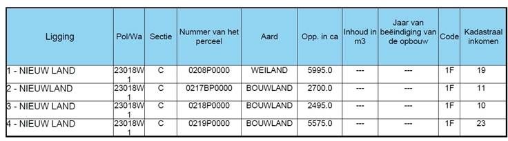 Vier percelen bouwland/weiland gelegen te Elewijt (zie kadastraal uittreksel tussen foto's of documenten), met een totale oppervlakte van 1 hectare 67 are 65 ca. De percelen zijn gelegen aan het einde van een doodlopende straat en zijn gemakkelijk toegankelijk via de openbare weg.
