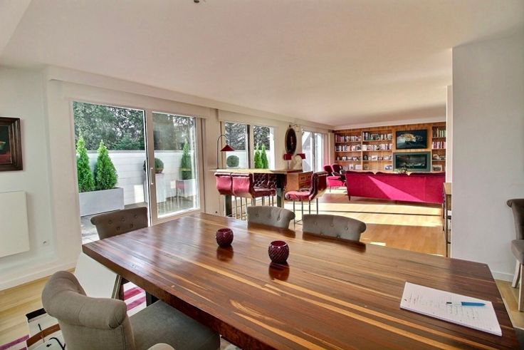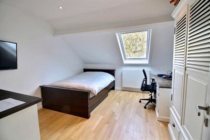 In het hart van Fort-Jaco, in een klein, rustig condominium, prachtige penthouse flat op de 2e en bovenste verdieping, volledig gerenoveerd in 2019. Het appartement bestaat uit ruime ontvangstruimten met parketvloer (+/- 70 m2) die uitkomen op een goed georiënteerd terras, een tv-lounge, een bureau (+/- 25 m2), een grote keuken met ontbijthoek (23 m2) en aparte bijkeuken, 3 slaapkamers (20, 18, 12 m2), kleedkamers, 3 doucheruimtes en 2 zolders. Het appartement heeft ook een mooie privétuin van 125 m2 en terrassen (30 en 10 m2). Condensatieketel op gas, dubbele beglazing, alarm, lift met directe toegang tot de flat. De flat is met smaak en detail gerenoveerd (airconditioning in slaapkamers op het zuiden, rolluiken, terrasverwarmers, nieuw tuinhuisje, nieuw geïsoleerd dak 2022). Klein flatgebouw 2 parkeerplaatsen + 2 kelders + externe parkeerplaats voor bezoekers. EPB: D+. Elektriciteit in overeenstemming