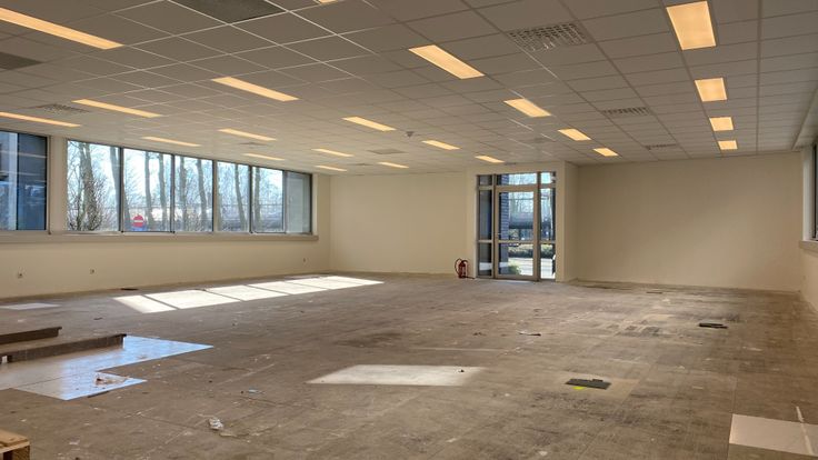Casco oplevering met contributie van de eigenaar voor vloertegels €25/m² excl. BTW, plafondtegels €25/m² excl. BTW en ledverlichting + bekabeling €30/m² excl. BTW en incl. plaatsing