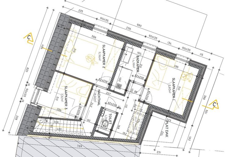 Op de bovenverdieping is er de nachthall, 2e afzonderlijk toilet, ingerichte badkamer en 2 of 3 slaapkamers. Loten 2 en 3 hebben een vaste trap naar de dakverdieping waar er nog 2 slaapkamers en een technische bergruimte zich bevinden. Lot 4 heeft een bergzolder te bereiken via een zolderluik.