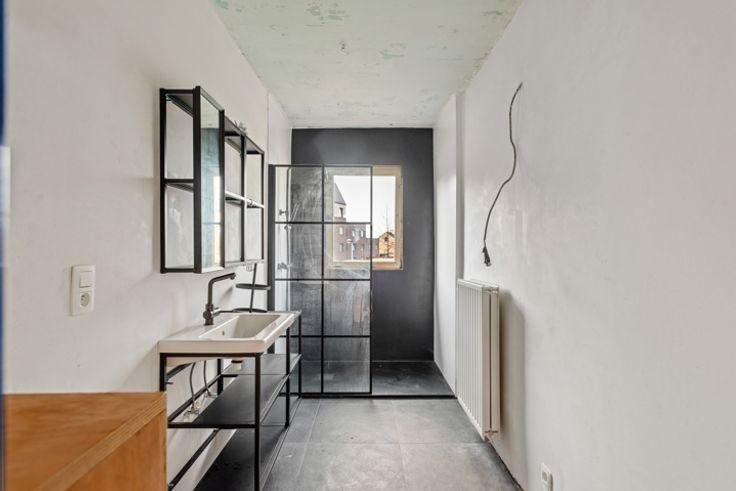 Op de eerste verdieping bevindt zich een lichtrijk appartement met twee slaapkamers, een vernieuwde badkamer en eigentijdse afwerking. Dit woongedeelte is ideaal voor eigen bewoning of verhuur en kan worden uitgebreid tot een ruime gezinswoning met tuin.