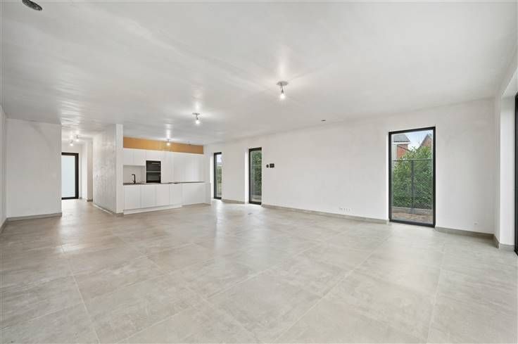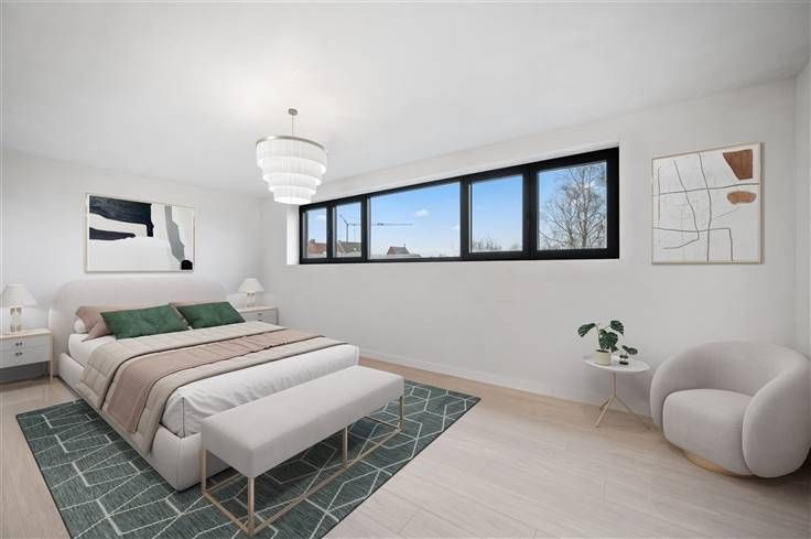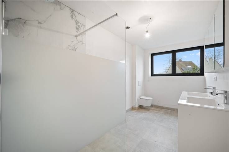 Wie de prijs/kwaliteit verhouding analyseert, krijgt hier zeker waar voor z’n geld, met liefst 3 kamers. Alle nieuwe technieken worden hier toegepast: gelijmde gevelsteen, venilatiesysteem D, lucht/water warmtepomp, warmtepompboiler, overal vloerverwarming, 12 zonnepanelen, kabel voor laadpaal. Qua stijl passen de zwarte aluminiumramen met een grote trekker op de voordeur goed bij de vlakke dakpannen, de gelijmde gevelsteen en de betontrap met zwarte natuursteen. Binnen werd gekozen voor lichte tegels van 80x80 cm en een zwart werkblad in de witte open keuken, waar er opvallend veel kastruimte aanwezig is, plus een geheime doorgang naar een ruime berging. Wat betreft de apparaten zijn de volgende voorzien: een kookplaat met centrale afzuiging, een koelkast, een vriezer, een combi-oven, een microgolfoven en een vaatwasser. Vanuit de keuken en grote living, hebt u via een zeer breed schuifraam een mooi zicht op de omheinde tuin, een achterliggende weide met schaapjes van de buurman en het terras, met tegels van 1x1 m. In de inkom is plaats voor een vestiairekast en boven, op de 1ste verdieping, spotten we nog een extra berging. In de badkamer valt ons oog op 2 plafondhoge tegels in de inloopdoouche, een hangtoilet en een dubbel meubel met spiegel. De grootste van de drie kamers, neemt de hele breedte van het huis in beslag. Wat niet is inbegrepen, is het aanplanten van planten in de tuin en de installatie van trapbalustrades, omdat daar de smaken zeer uiteenlopend kunne