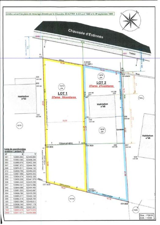 L'étude du Notaire Pol DECRUYENAERE, a le plaisir de vous proposer à la vente, une parcelle de terrain, à prendre dans la parcelle actuelle section B numéro 0187KP0000, sise à Waudrez, Chaussée d'Estinnes (entre le numéro 48 et le 52). La parcelle fait l'objet d'une division par plan de géomètre, reprenant la parcelle sous liseré jaune et Lot 1 au plan repris dans les photos ci-jointes; étant mesurée de 7 ares 10 centiares (7a10ca). Nous vous invitons à vous renseigner auprès du service urbanisme de la Ville de Binche afin d'en savoir davantage sur les modalités de construction possibles. En cas de projet de construction, nous vous prions de prendre contact également auprès d'un architecte afin d'analyser votre projet. Néanmoins, il vous fa ment un permis d'urbanisme avant de débuter tout chantier. Merci de vous rendre sur place directement afin de visiter la parcelle vendue. (+- 15m en façade, +- 46m de profondeur) Les éventuelles demandes d'offre peuvent nous être envoyées à l'adresse mail suivante : immoweb@notairedecruyenaere.be, nous vous répondrons dans les meilleurs délais.