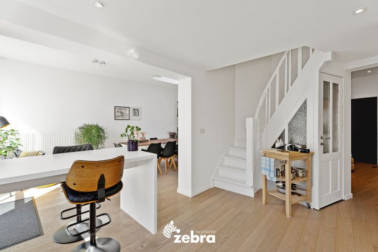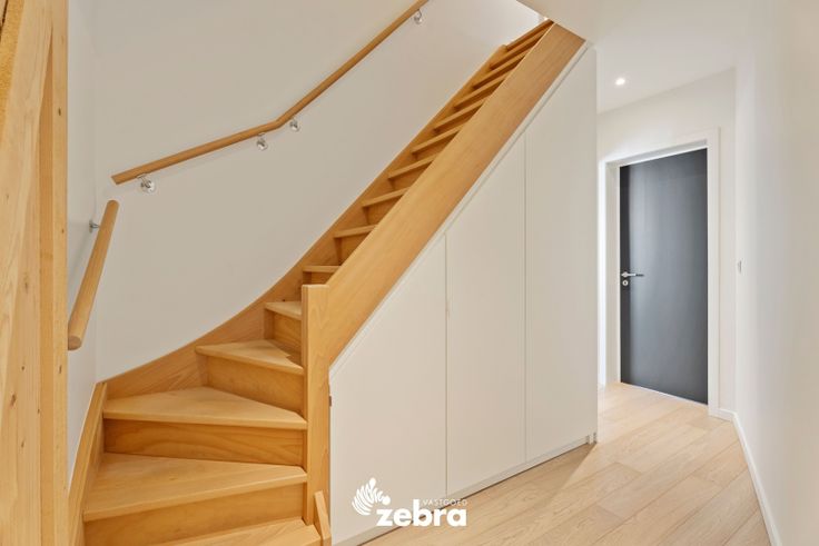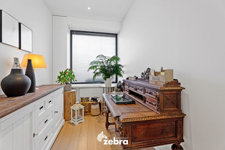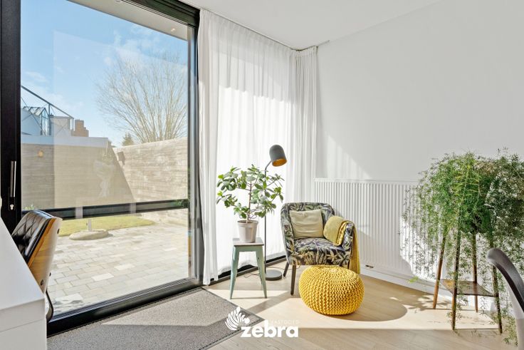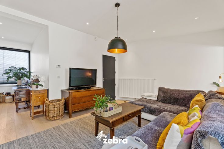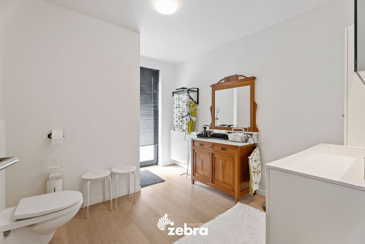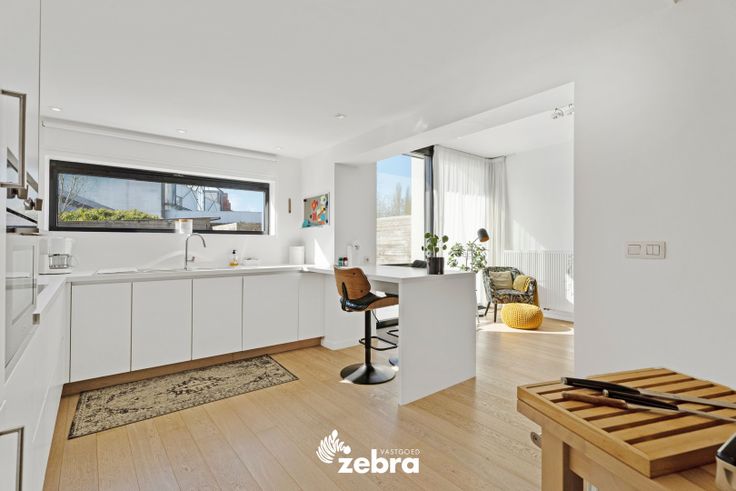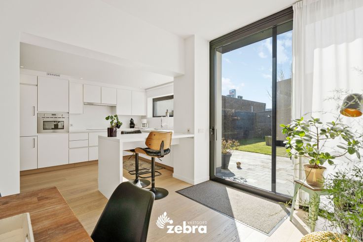 Op het gelijkvloers vind je een stijlvolle inkomhal met vestiaire en gastentoilet, een ruime en lichtrijke leef- en eetruimte met parketvloer, een bureau/speelruimte voor de kinderen en een volledig uitgeruste keuken. De keuken is voorzien van een combi-oven, microgolfoven, dampkap, een inductiekookplaat, koelkast, diepvries vaatwasser en spoelbak.