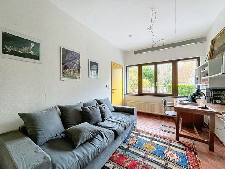 Met twee ingangen, waaronder een discrete toegang aan de tuinzijde langs de Woluwe, biedt deze woning talrijke mogelijkheden: een aparte bureau-ruimte ideaal voor thuiswerk, een vrij beroep (praktijk, wachtkamer) of een hobby (schilderen, beeldhouwen, wijnproeven, enz.).