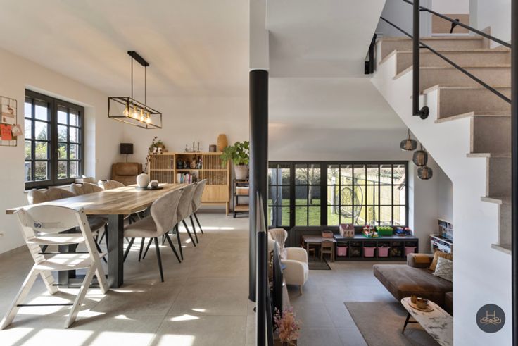 Via de inkomhal, met gastentoilet, betreden we de volledig uitgeruste, open keuken met eetkamer. De trapjes in de woning geven een leuke interactie met de lichtrijke leefruimte . Het niveauverschil zorgt voor een gezellige sfeer en geeft de woning extra cachet.