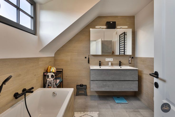 Op de eerste verdieping bevinden zich 3 ruime slaapkamers, een eerste badkamer met dubbele lavabo, toilet en bad + een tweede douchekamer met lavabo.