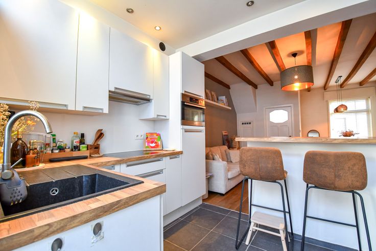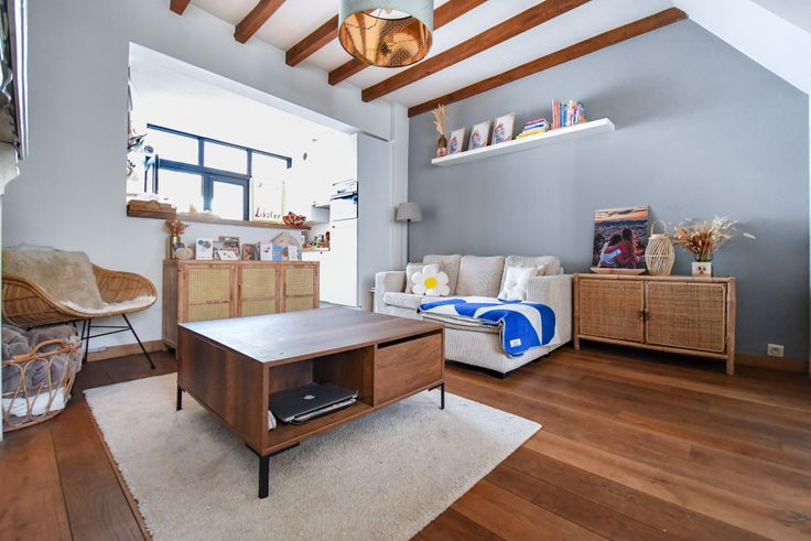 De indeling is als volgt: inkom, gezellige mooi afgewerkte woonkamer met oa. een parketvloer, gashaard, eetruimte, ingerichte keuken met eiland, veranda en toilet.