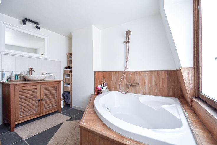 Boven bevindt zich een ruime slaapkamer, kruipzolder, 2de kamer met dressingmogelijkheden en aansluiting voor wasmachine en droogkast. De badkamer beschikt over een ruim hoekbad en wastafel.