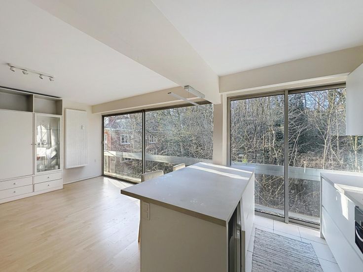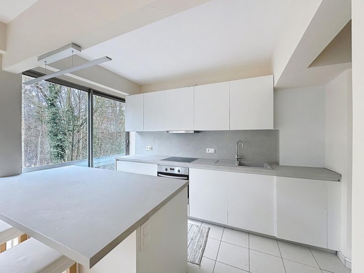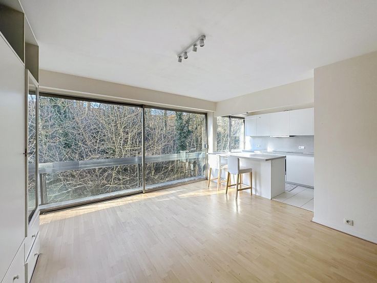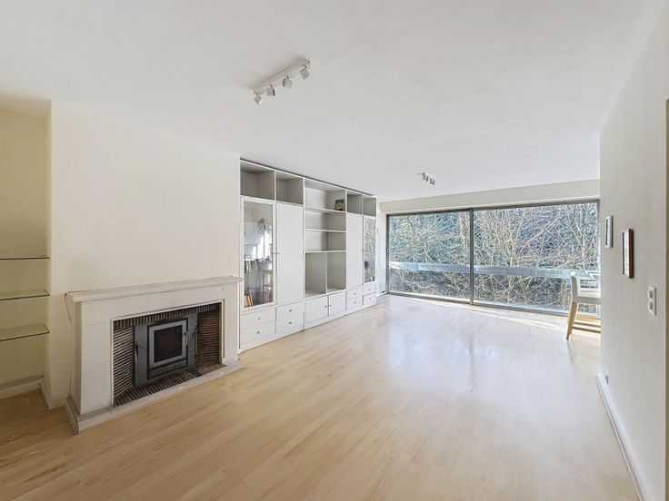 De woonkamer (+/- 29 m²) is licht en uitnodigend dankzij de grote ramen en biedt een prachtig uitzicht op het groen. Een decoratieve open haard zorgt voor een gezellige sfeer. De keuken is recent gerenoveerd, volledig uitgerust en open naar de living. De inkomhal beschikt over een ingebouwde kast, en er is ook een aparte wasruimte (buanderie) voor extra gemak. Er is bovendien een kelderruimte en een parkeerplaats in de onderverdieping (+25.000 EUR).