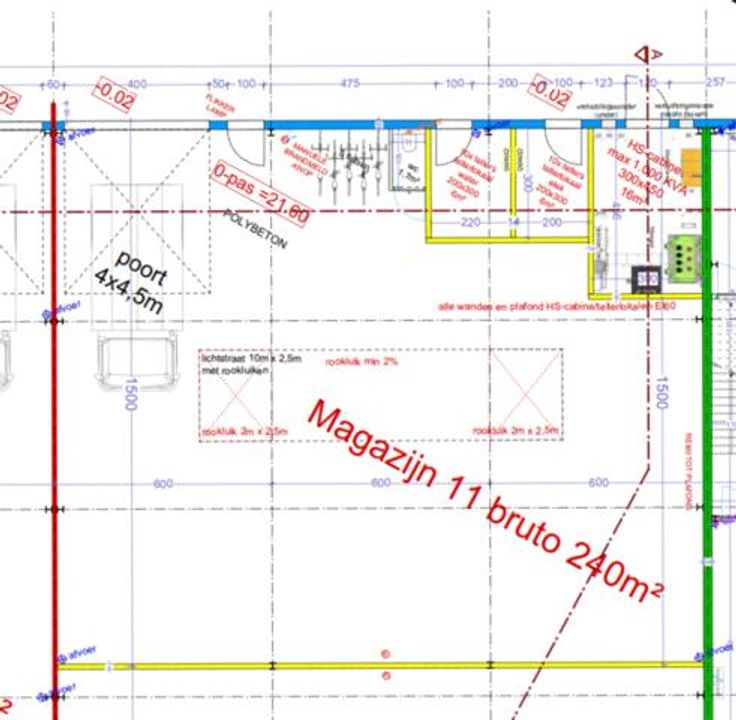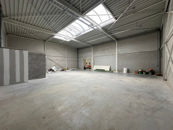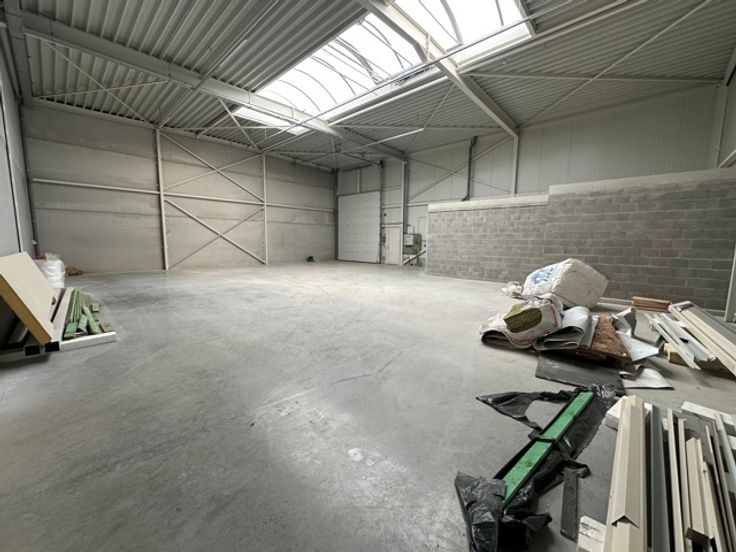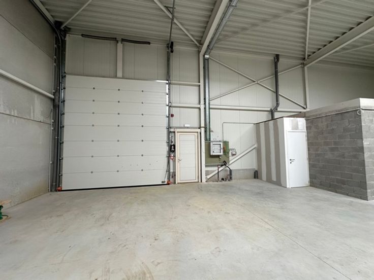 De hal heeft een hoogte van 7 meter en beschikt over een sectionale poort van 4,5 meter hoogte. Alle voorzieningen zijn aanwezig zoals een toiletruimte, elektriciteit, drijfkracht, ...