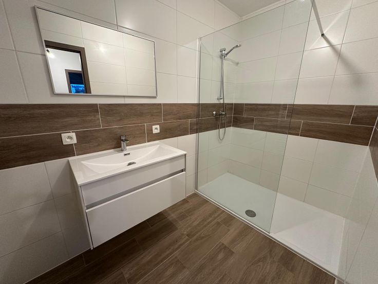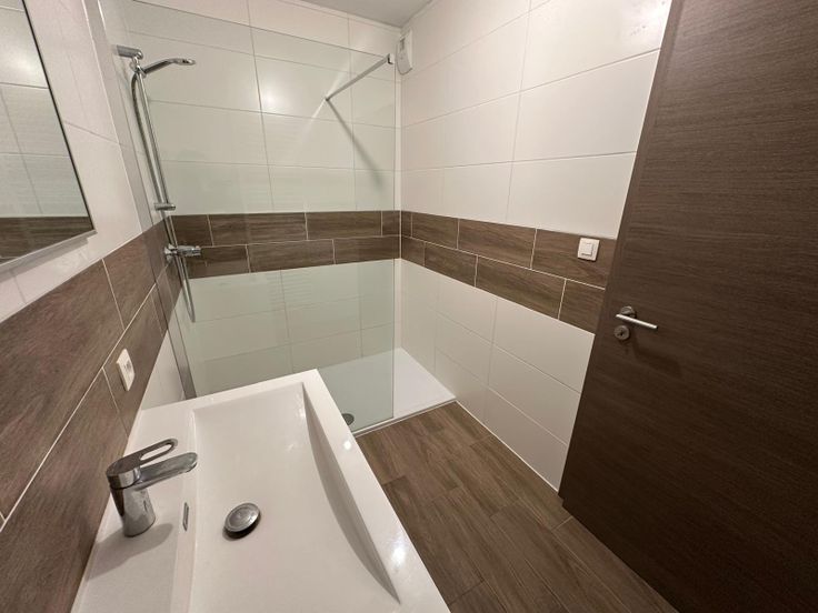 Salle de douches avec douche, meuble lavabo et radiateur sèche-serviettes 🚿
