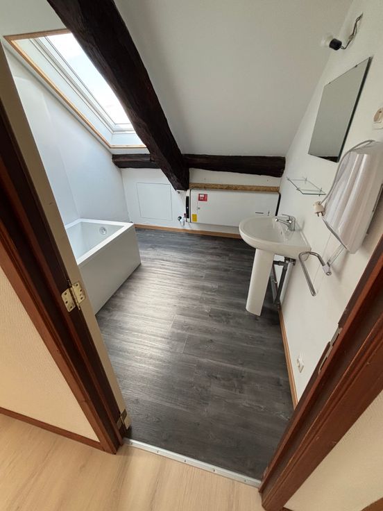 Appartement situé au 1er étage comprenant un séjour, une cuisine, 3 chambres, une salle de bains, un WC. Poutres apparentes, endroit calme et verdoyant. Chauffage électrique, châssis DV. Jardins communs (à l’avant avec espace parking et à l’arrière), pas de garage, pas de cave, pas d’ascenseur.
