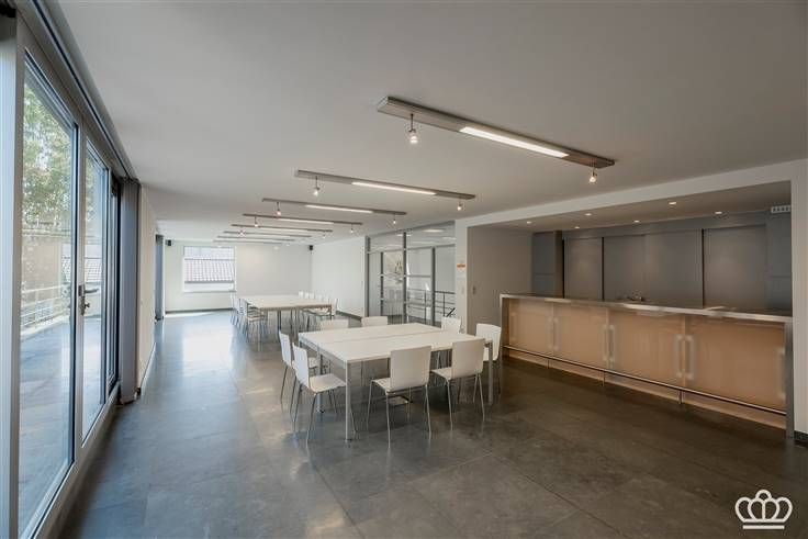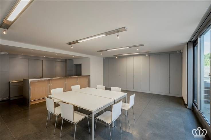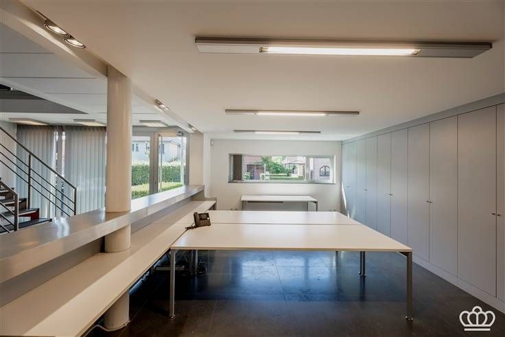 De eerste verdieping omvat een hal die toegang geeft tot een ruime polyvalente ruimte/ vergaderzaal, met een kitchenette en een kleine berging. Verder geeft de hal toegang tot twee grote kantoren.