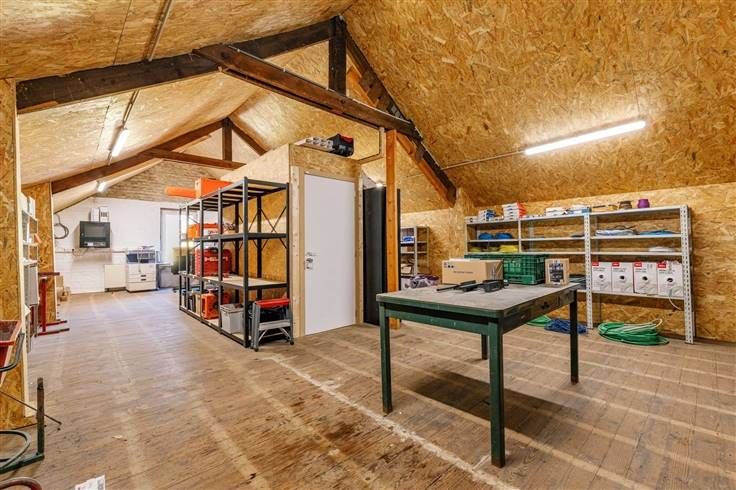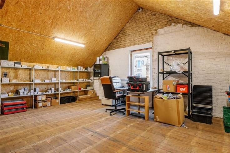 Boven biedt een praktische zolderopslagruimte een ideale oplossing voor het organiseren van uw bedrijfsbenodigdheden of documenten. Het pand beschikt ook over eenwerkplaats met grote capaciteit, perfect voor elke activiteit waarvoor veel ruimte nodig is.