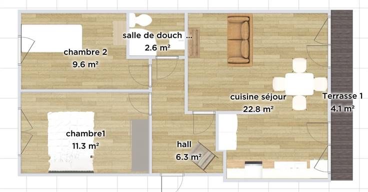 L'espace de vie principal présente un séjour accueillant avec une décoration moderne, parfait pour des moments de détente ou de convivialité. La cuisine, bien équipée, offre un espace fonctionnel avec des rangements optimisés, facilitant la préparation de vos repas quotidiens.