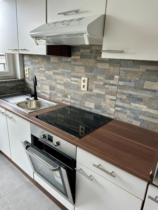 leefruimte, keuken (kookplaat, dampkap, oven, nieuwe koelkast), twee slaapkamers, badkamer (douche in ligbad, lavabo), apart toilet.