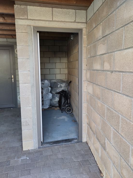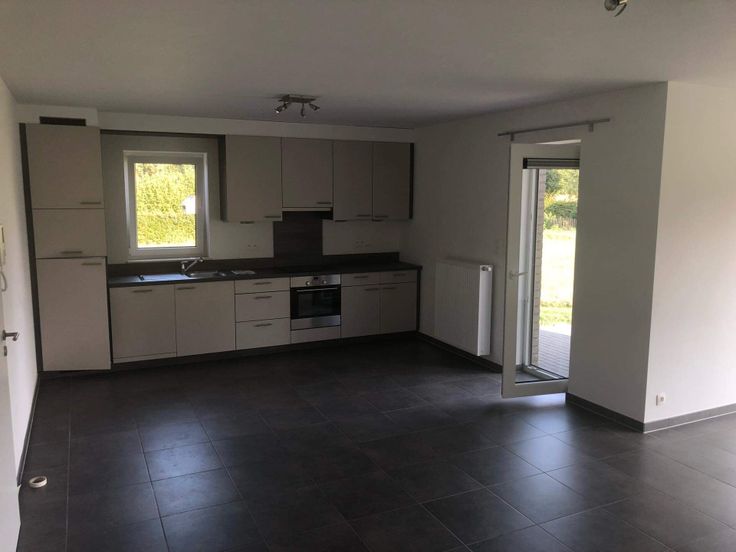 Appart. 2 ch au Rez-de-chaussée situé dans un endroit tranquille et proche de tout, petit jardin, cuisine équipée ouverte sur living, SDB baignoire et douche, WC séparé, débarras, cave, 2 emplacements extérieurs,