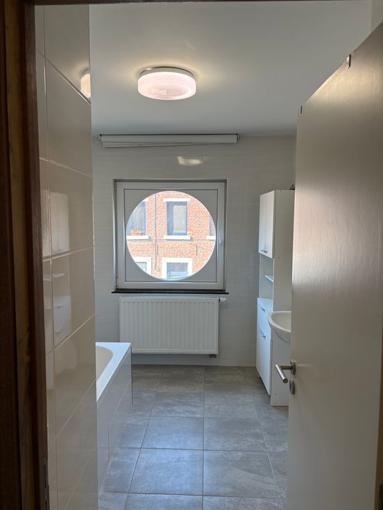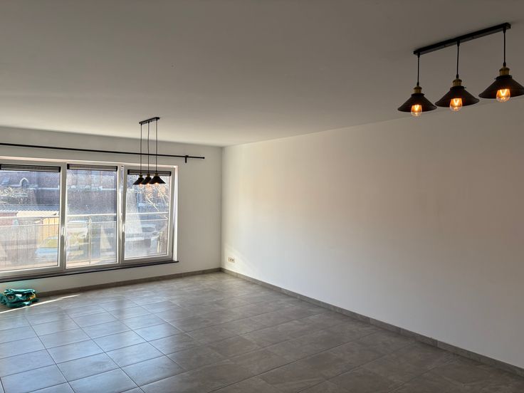 Place de Ghlin,appartement traversant très lumineux -2 chambres, sdb,cuisine semi-equipée,buanderie,immeuble récent.