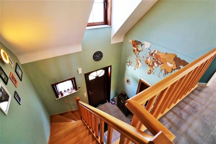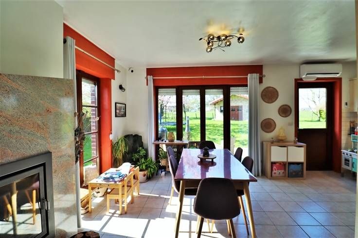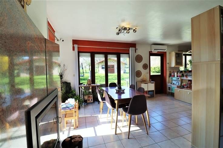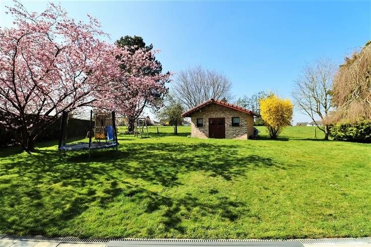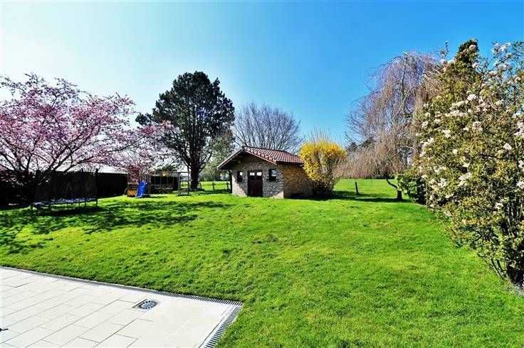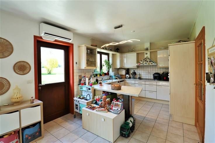 Au rez-de-chaussée : hall d'entrée, WC indépendant avec lave-mains, vaste séjour (salon/salle à manger) ouvert sur la cuisine complètement équipée (four, micro-ondes, frigo, taque à induction, hotte, lave-vaisselle, évier et de nombreux meubles de rangement) vous offrant une vue et un accès sur le jardin, garage avec porte motorisée et coin buanderie.