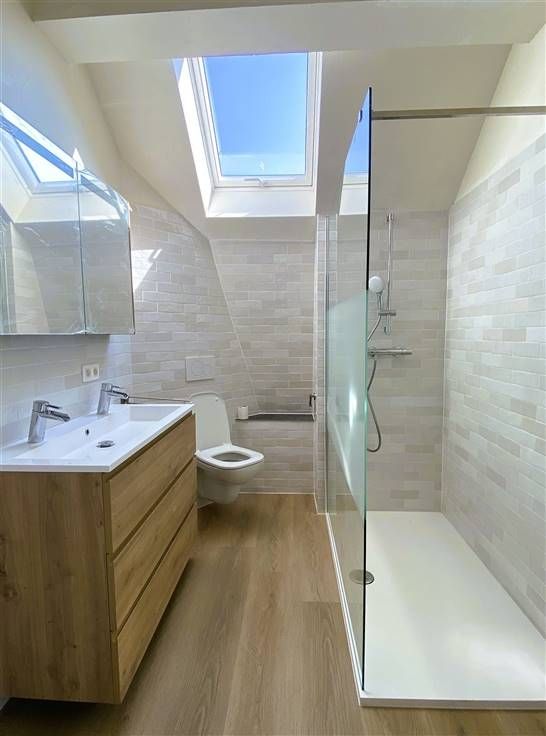 De badkamer is stijlvol afgewerkten beschikt over een inloopdouche en dubbele wastafel, wat het ochtendritueel een stuk aangenamer maakt.