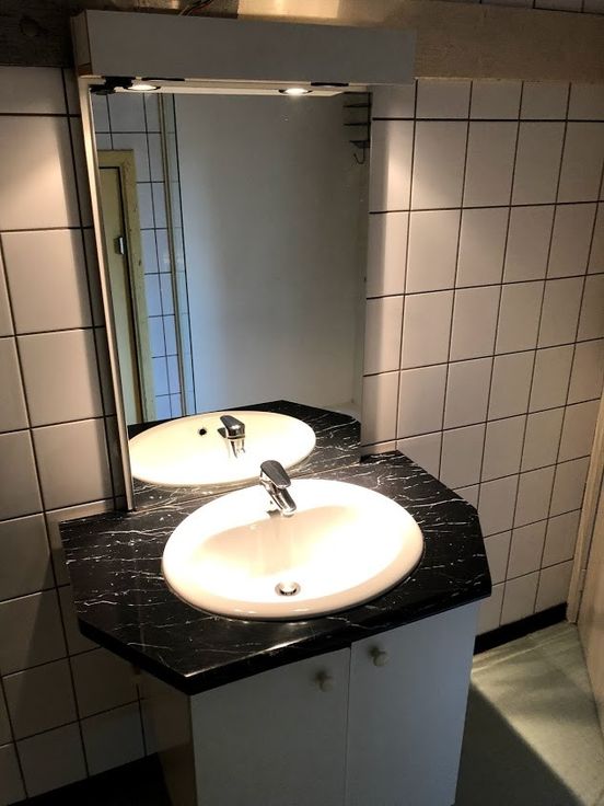 Ook vind je hier de badkamer die voorzien is van een douche, lavabo en aansluiting voor wasmachine.