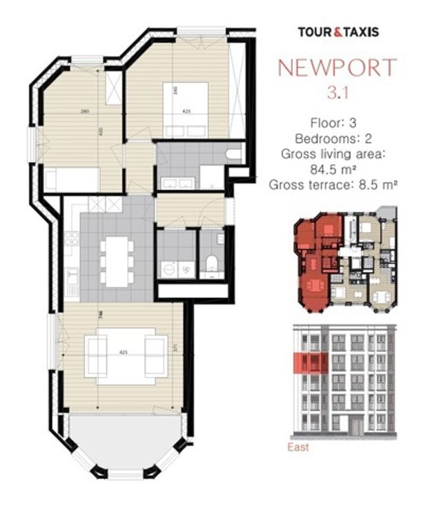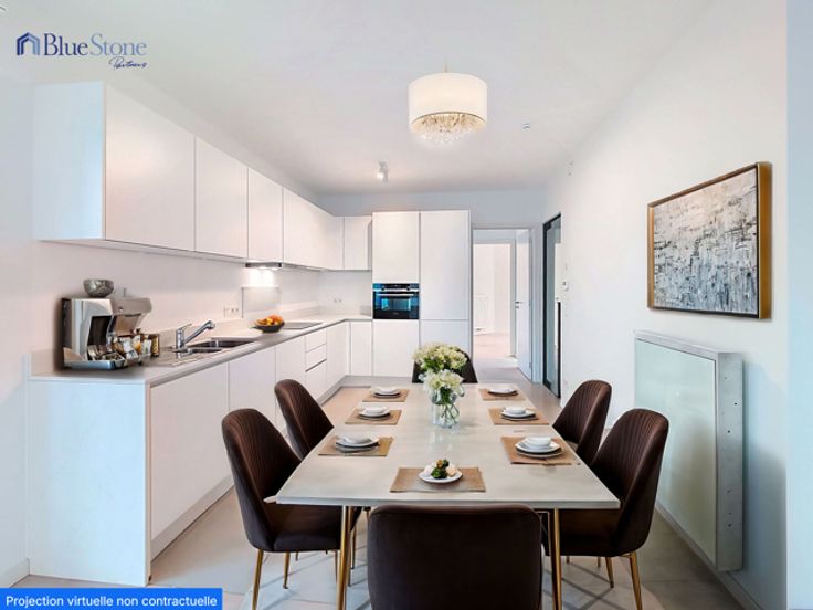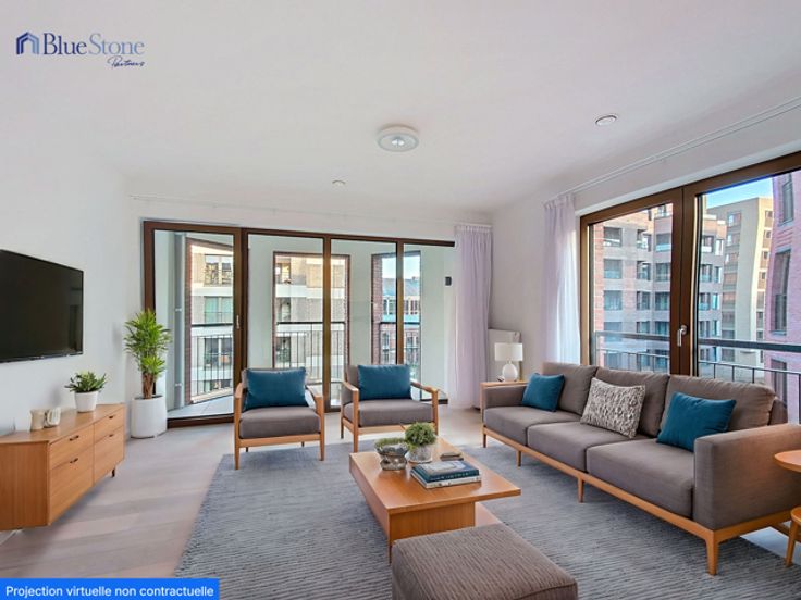 Cet appartement neuf et charmant de deux chambres se situe au troisième étage de la résidence Newport, sur la Drève du Parc, à Tour & Taxis. Grâce à son emplacement central, les magasins, les transports en commun, les restaurants et les cafés sont tous accessibles à pied, ce qui en fait l’endroit idéal pour celles et ceux qui recherchent commodité et confort. L'appartement se compose comme suit : un hall d’entrée spacieux avec toilette séparée, un salon lumineux avec une cuisine ouverte entièrement équipée, une salle de douche avec double vasque, deux chambres, une terrasse de 8 m², ainsi qu’une buanderie avec raccordements pour machine à laver et sèche-linge. Provisions de charges : 160 €/mois (charges communes, chauffage, eau chaude). Chaudière commune au gaz, ventilation double flux, triple vitrage, porte blindée, videophone, ascenseur. Ne manquez pas l’occasion d’être les premiers à vivre dans cet appartement moderne et idéalement situé ! Pour obtenir plus d’informations ou organiser une visite, contactez-nous au +32 2 377 76 95 ou via info@bluestone-partners.be.