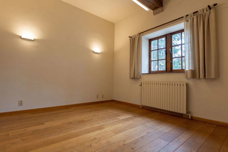A l’étage deux grandes chambres avec charpente apparente, le dégagement du hall de nuit permet de créer une salle d’eau.
