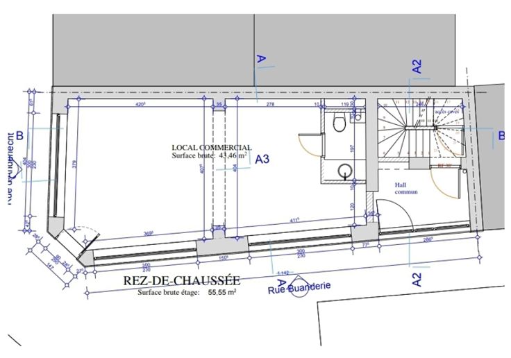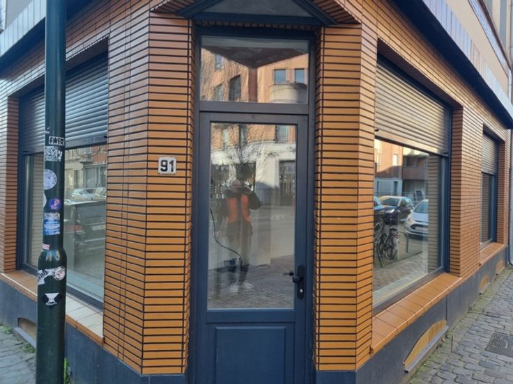 Centre Ville: Commerce de Coin (rue Anderlecht/ rue Buanderie) : largeur vitrine de 17 M, lumineux, nombreuses possibilités d'exploitation (Horeca, cabinet médical, profession libérale, etc...). WC séparé, cave en sous-sol. Surface de 43 M². Nouveaux châssis bois. A proximité transports en commun, écoles, commerces, centre sportif, ... Renseignements et visites au 0475/43.21.47.