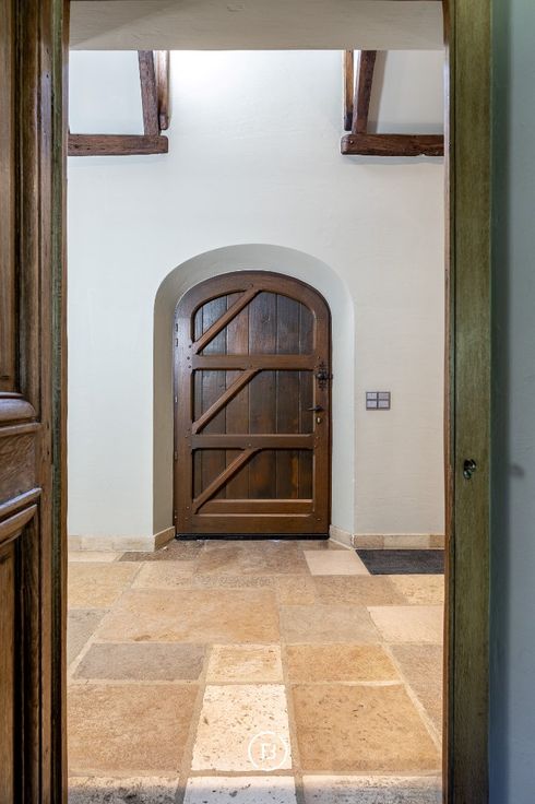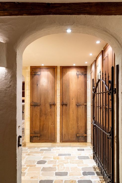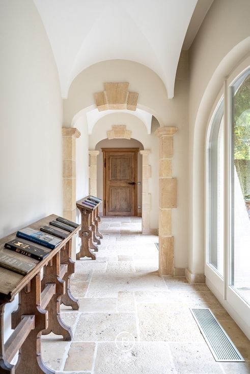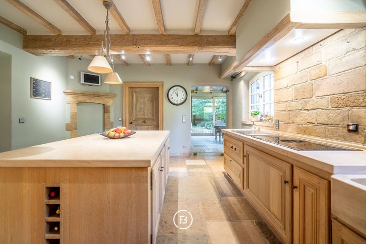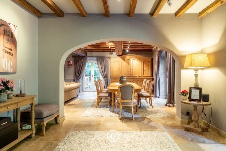 Binnenkomen doe je via een sfeervolle kloostergang die leidt naar de riante leefruimte met open haard – een warme, uitnodigende plek voor gezellige familiemomenten of stijlvolle ontvangsten. De aansluitende eetkamer en de orangerie bieden telkens een schitterend uitzicht op de aangelegde tuin. De landelijke keuken, volledig uitgerust en tot in de puntjes afgewerkt, is een droom voor elke kookliefhebber. Verder zijn er praktische ruimtes zoals een wasplaats, een wijn- en voorraadkelder, en een technische berging.