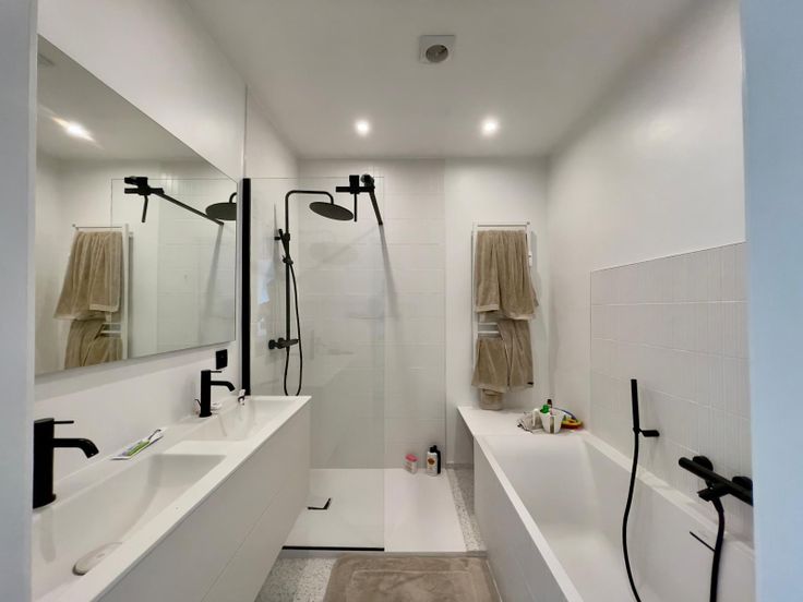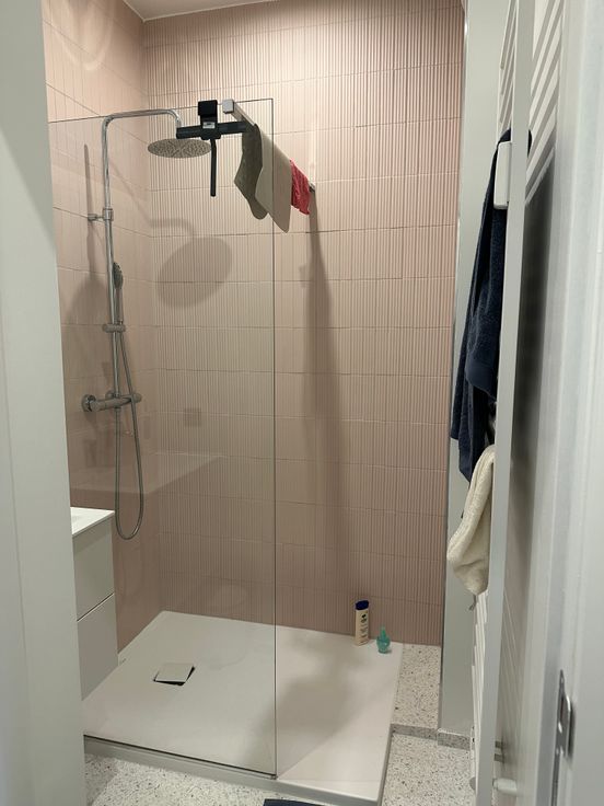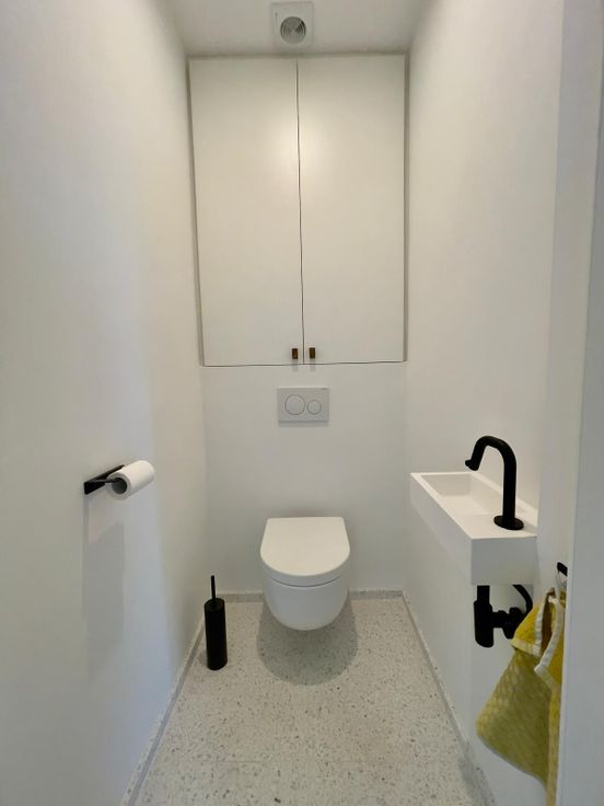 Une deuxième aile à l'arrière comprend une salle de douche avec lavabo, WC séparé, et chambre d'enfant avec placards intégrés dans le couloir.