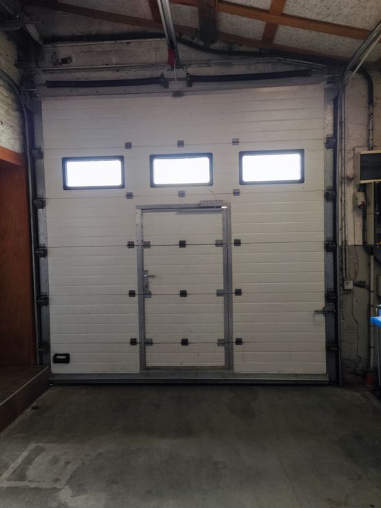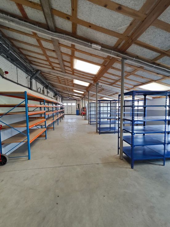 Entrepôt avec bonne isolation + éclairage + chauffage possible - béton lissé au sol - 220 V x 380 V disponible - porte sectionnelle électrique - rayonnage d'atelier - alarme incendie + extincteurs