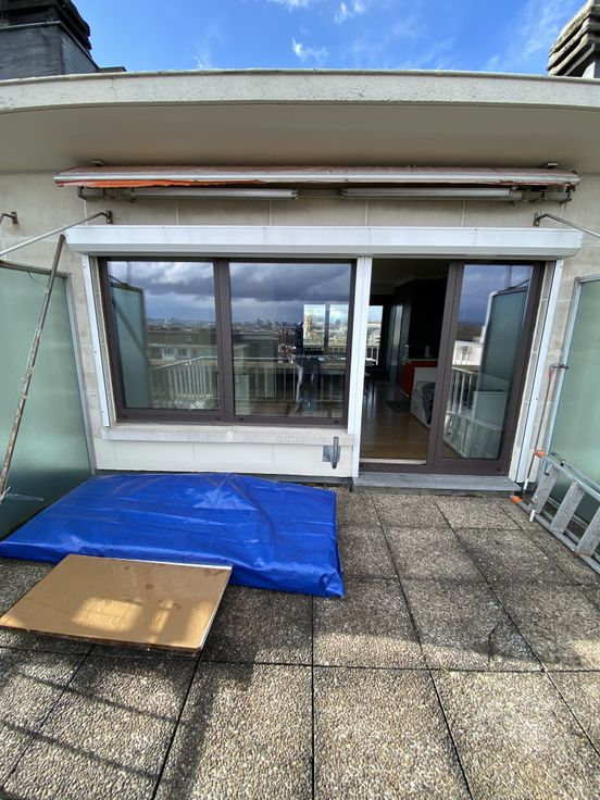 Groot terras met uitzicht op het Atomium aan de ene kant en de Basiliek aan de andere kant.