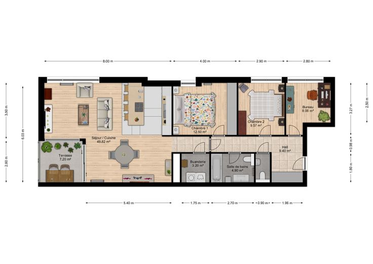 Il se compose de trois chambres spacieuses, d’une agréable pièce de vie lumineuse avec cuisine ouverte entièrement équipée, d’une salle de bains (douche + baignoire), d’une buanderie, ainsi que d’une belle terrasse orientée sud-ouest. L’ensemble bénéficie d’excellentes performances énergétiques (PEB A), garantissant une consommation réduite.