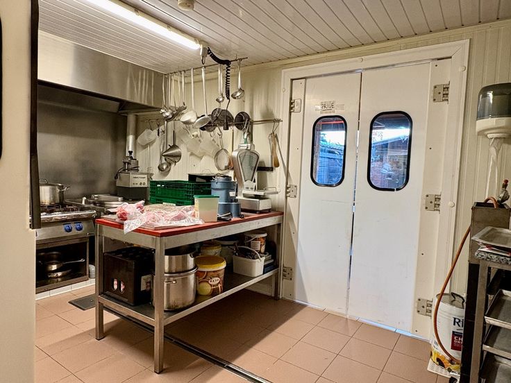 De tuin is volledig geïnstalleerd in functie van de slagerij. Rooktoestellen, kooktoestellen, frigo, diepvries, stockage,.. Alles is voorzien in het achterhuis.