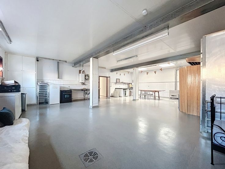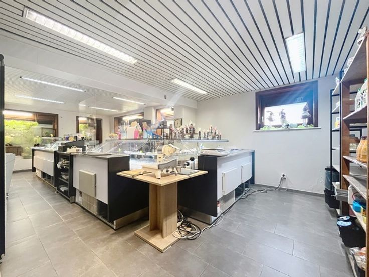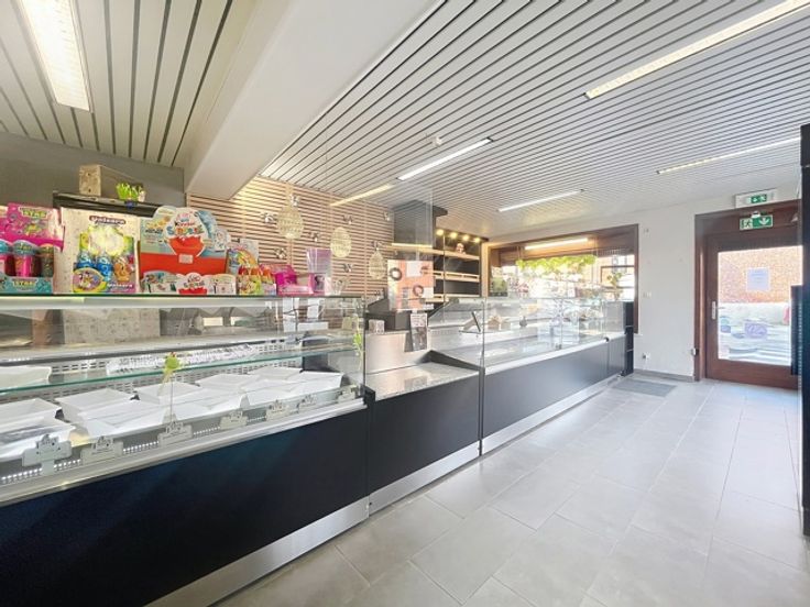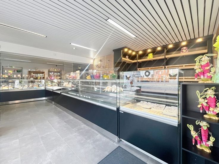 Magasin de +/- 40m² avec belle vitrine d'angle, bureau avec accès latéral, atelier aux normes européennes de +/- 180m² sur l'arrière (plan de travail en marbre, coin sanitaire, pièce arrière avec silo à farine, congélateurs, petit débarras, terrasse et jardin, 3 garages dont un avec porte sectionnelle motorisée, parking privatif pour 4 à 5 voitures en devanture. Libre le 1er septembre 2025. Plus d'infos sur www.dlgroupe.com