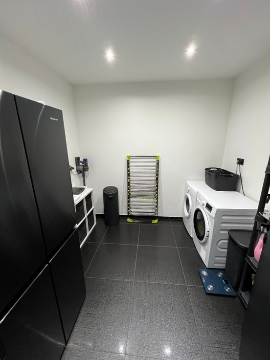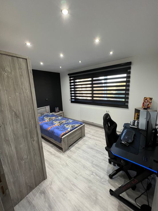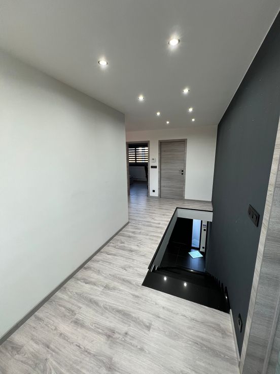Etage :Vaste hall de nuit- 2 chambres-bureau-salle de jeu ou de sport(30m²)-salle de douche. Sous-sol :Cave.