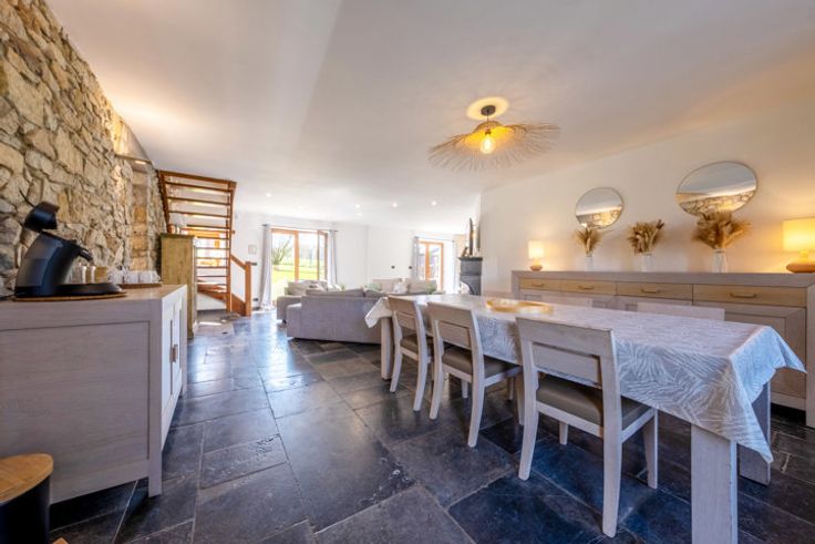 ZELDZAME KANS! Genesteld in het hart van het gehucht Hayen, een typisch dorp in kalkstenen brokken van Condroz, omringd door uitzonderlijke landschappen, op een steenworp afstand van het geklasseerde terrein van Trixhe Nollet, presenteren we u deze uitzonderlijke karaktervolle woning, een echte parel die onder geen beding mag worden gemist! Deze ruime boerderij biedt u de charme van vroeger met zijn prachtige zichtbare stenen, houten balken, blauwe stenen vloeren, gezellige ruimtes en alle comfort van vandaag! Op de begane grond bestaat het uit een inkomhal met een apart toilet en wastafel, een enorme leefruimte (woonkamer en 2 eetkamers) met toegang tot twee terrassen en een overdekt terras met een jacuzzi, evenals de prachtige beboste tuin met een vrij uitzicht op het platteland, een tweede woonkamer, een ingerichte keuken, een speelkamer of kantoor met opbergruimte en een doucheruimte met een wasruimte. Op de eerste verdieping zijn er 5 ruime slaapkamers, een apart toilet, een doucheruimte (inloopdouche, toilet, wastafel met kast), een prachtige badkamer (vrijstaand bad, dubbele wastafel met kast) en een kleedkamer. Diversen: twee ruime zolders, twee grote bijgebouwen die op 3 niveaus kunnen worden omgebouwd: 150 en 105 vierkante meter (voormalige schuren), een garage, 20 fotovoltaïsche panelen, houtkachel en een kelder. Mogelijkheid van een vrij beroep met een aparte ingang! Wacht niet, kom deze uitzonderlijke woning ontdekken door contact met ons op te nemen op 04/380.00