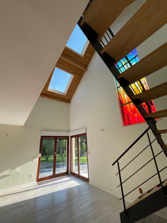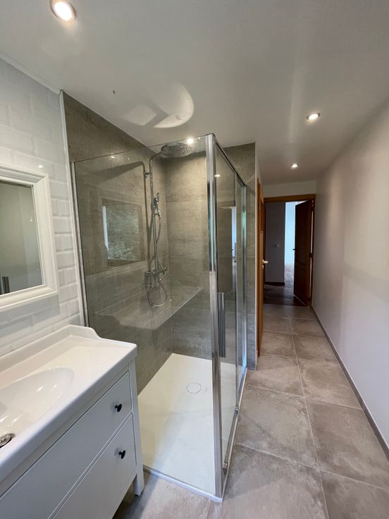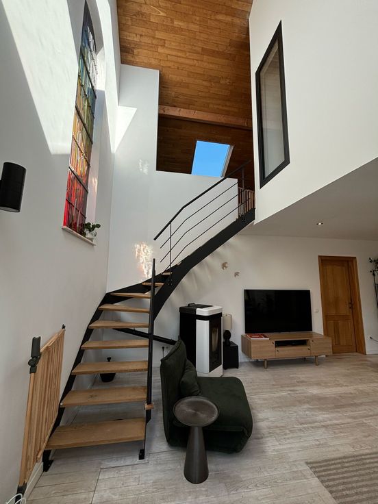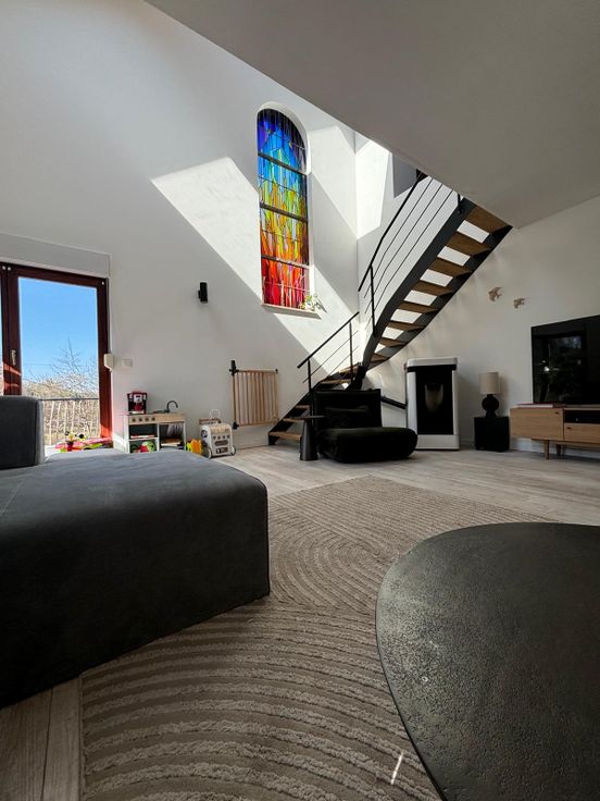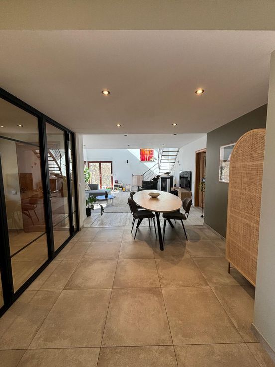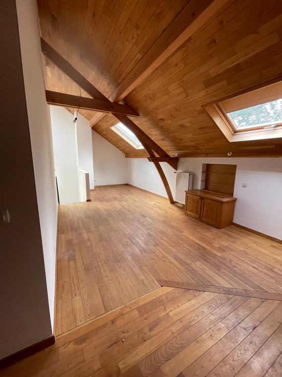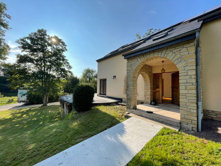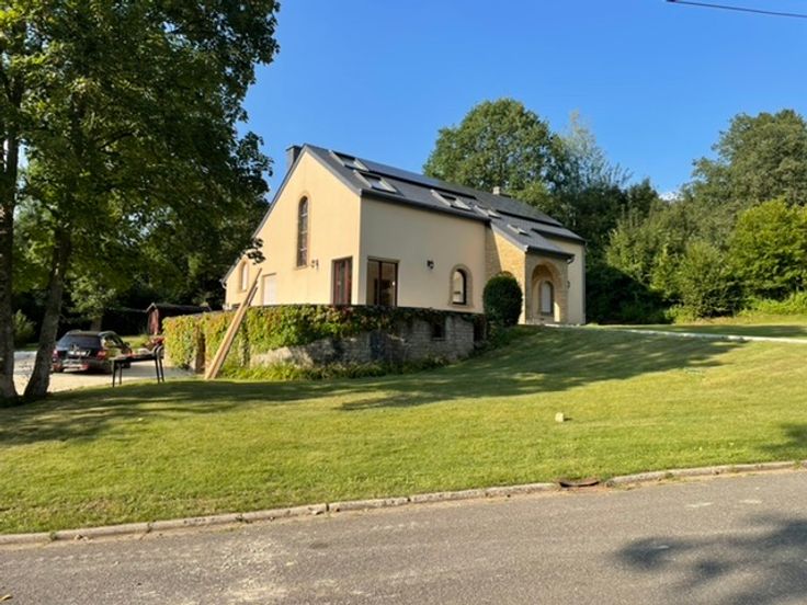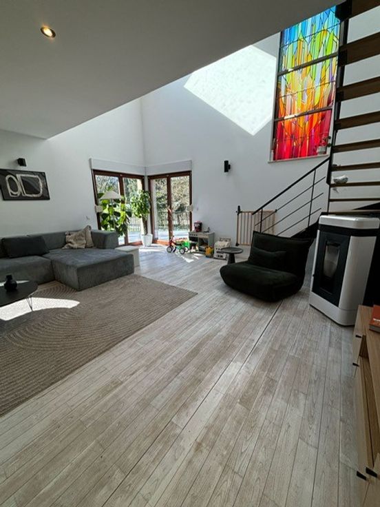 Maison récement rénovée située dans une voie sans issue menant à la foret. Vaste salon, salle à manger et nouvelle cuisine full équipée- bureau, 5 chambres, 3 salles de bain. Espace mezzanine- garage 1 voiture et caves. Chauffage au gaz et poele a pellet dans piece de vie. Panneaux photovoltaïques produisant électricité maison et chauffe eau solaire: participation de 120 euros par mois en sus. Jardin & studio independant -