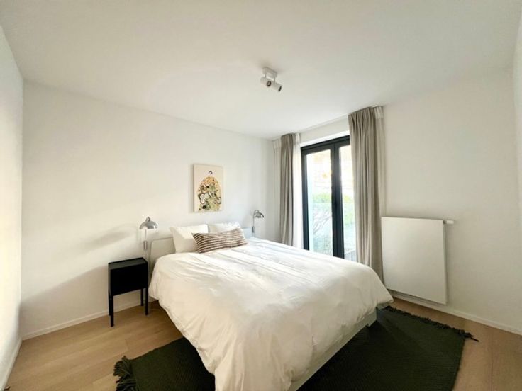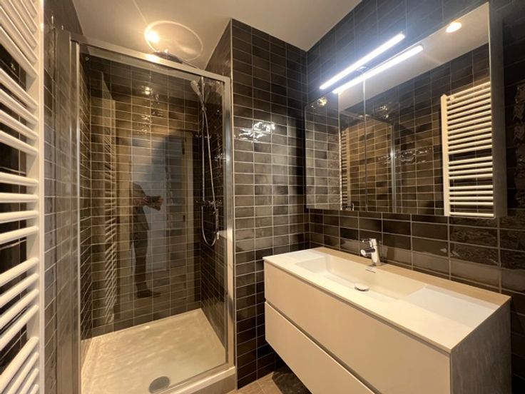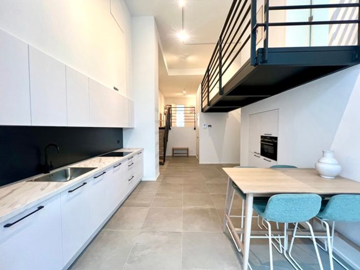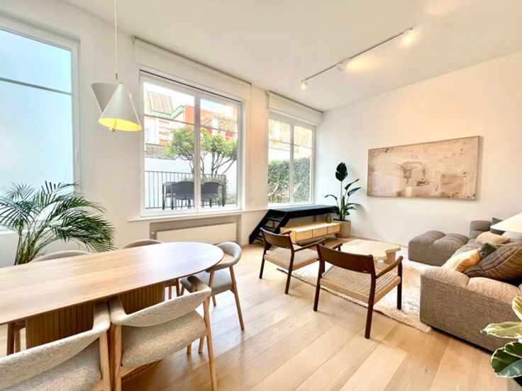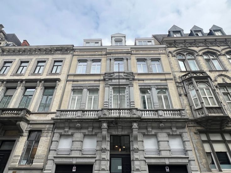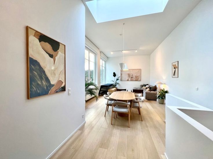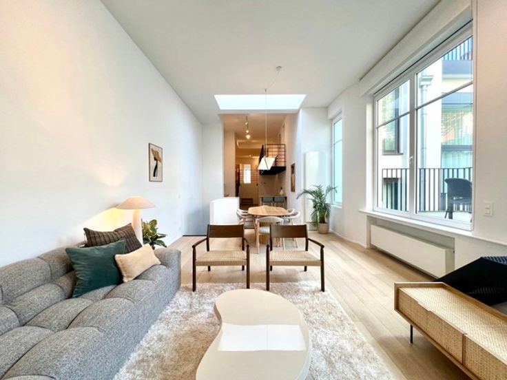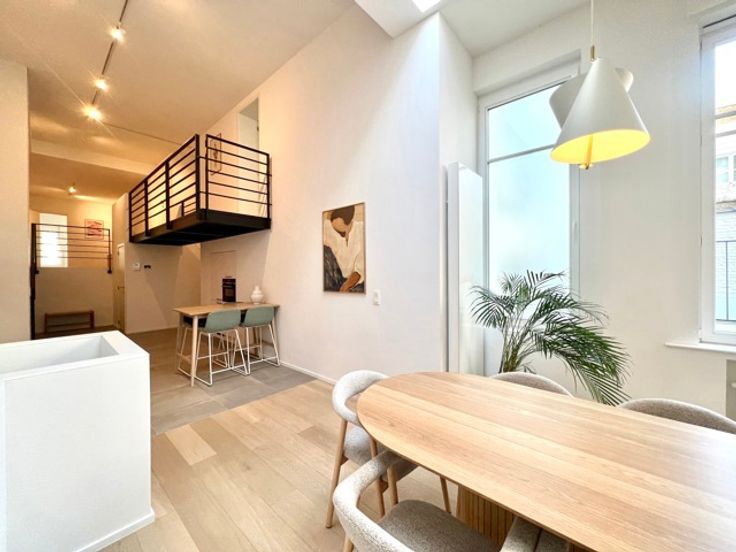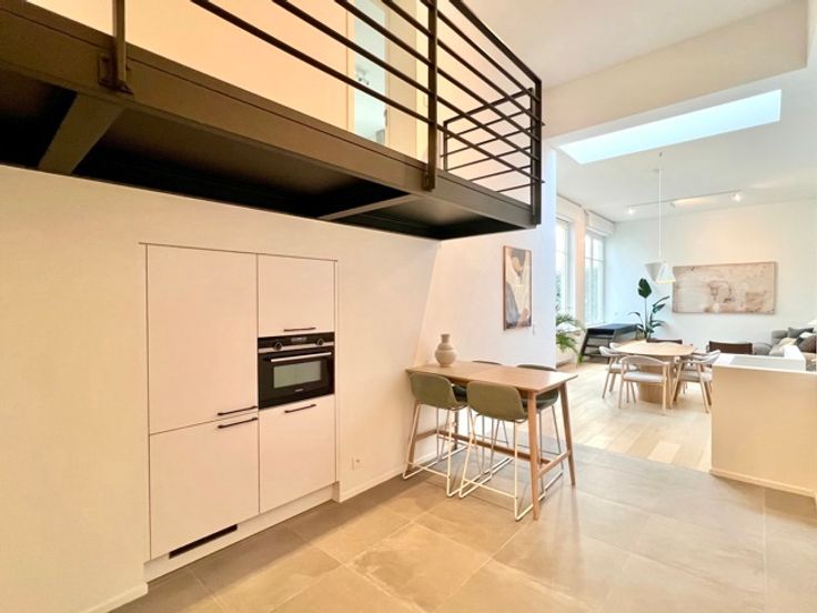 CONGRES - Bathim & co presents a superb, tastefully furnished, refurbished duplex apartment on the first floor at the rear of a superb mansion in the center of Brussels, close to shops, restaurants and public transport. The duplex comprises an entrance hall, dining room and fully equipped open-plan kitchen, living room and dining room with large bay windows giving access to the large 15m2 terrace, TV area, laundry room, 2 bedrooms with custom-made wardrobes and en-suite shower room, boudoir area between the two bedrooms, 2 separate toilets. Cellar. Indoor bicycle parking. Possibility of renting a parking space at 150€/month. Communal charges at 110€/month (maintenance of common areas, garbage cans, water softener, insurance).  Visit with Sascha.
