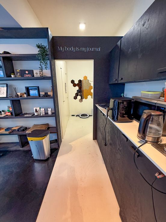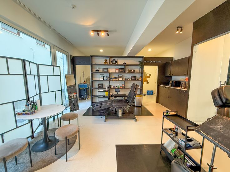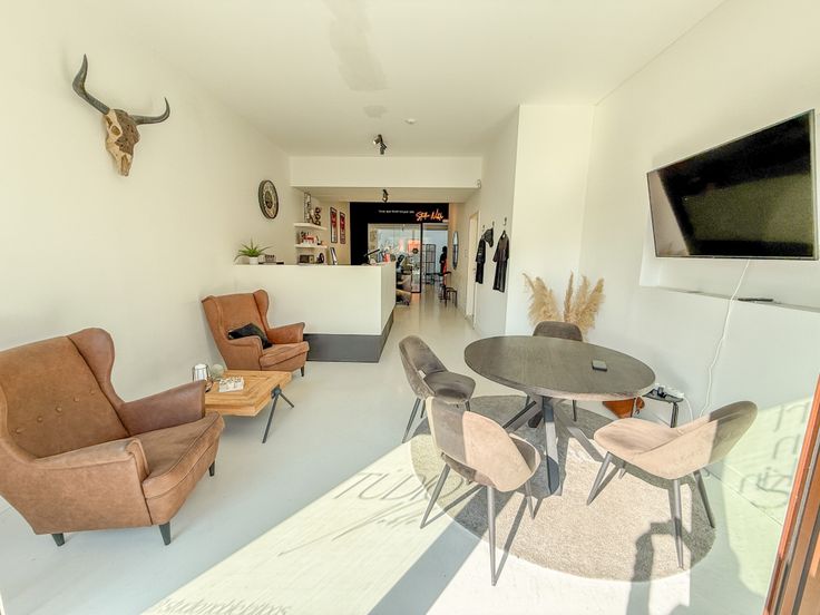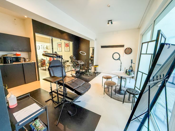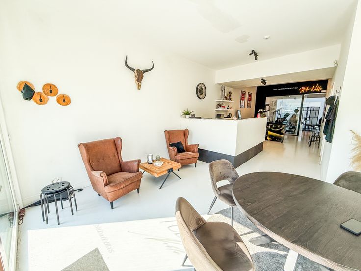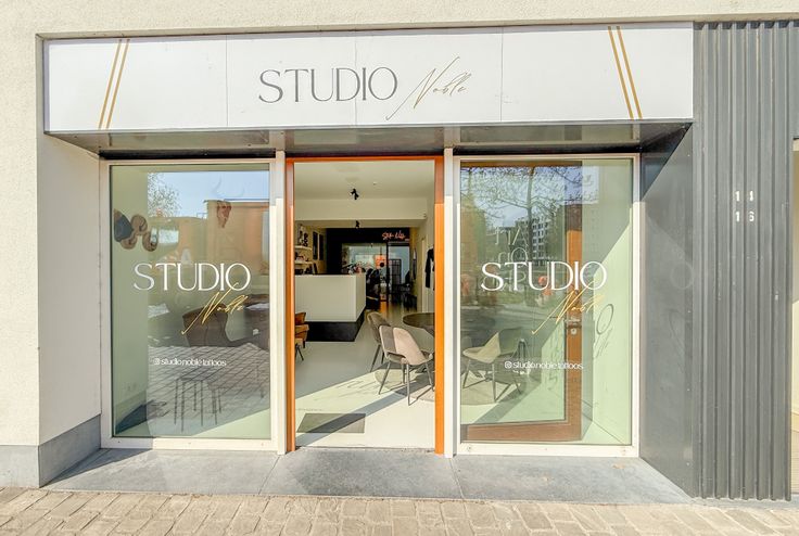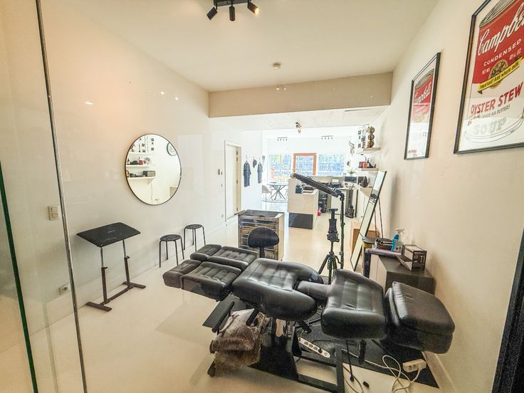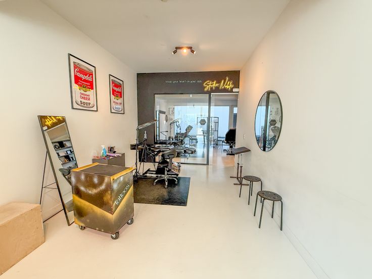 📸 Foto’s tonen de huidige invulling als tattoo artist shop en de vorige functie als immokantoor gespecialiseerd in Spaans vastgoed.