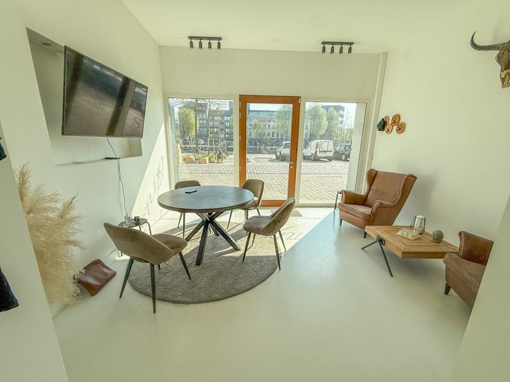 Het pand beschikt over een gevelbreedte van ca. 5 m met grote glaspartijen van vloer tot plafond aan voor- én achterzijde, wat zorgt voor overvloedig natuurlijk licht en een open, uitnodigend gevoel. De plafondhoogte van 3,2 meter versterkt het ruimtelijk effect en draagt bij aan de stijlvolle uitstraling.